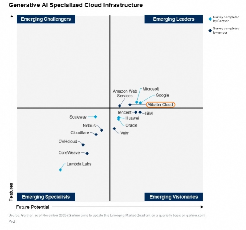 新兴领导者象限仅有微软、谷歌、AWS和阿里云四家厂商入围,阿里云是唯一入围的亚太厂商,IBM、Oracle、华为云和腾讯云位于远见者象限,Nebius、OVHcloud、CoreWeave等位于专业厂商象限,他们的优势还局限在单点能力级别。