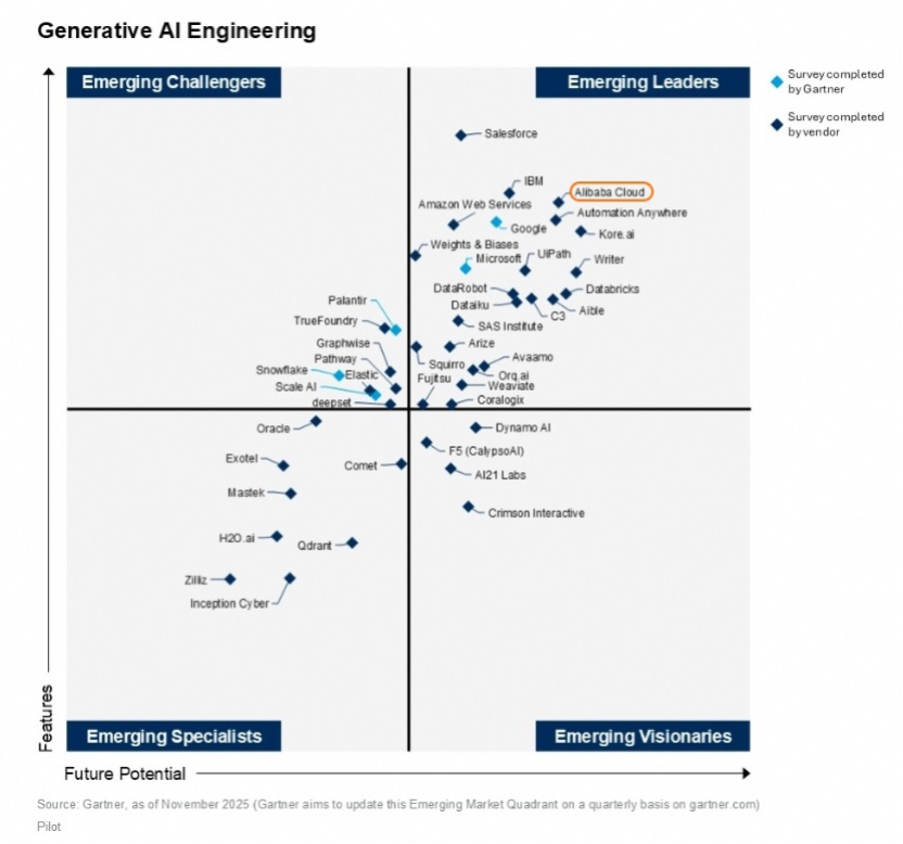 AI技术全栈,云厂商领跑11月中旬,市场研究机构Gartner发布4篇GenAI(生成式AI)技术创新指南系列报告,公布了GenAI云基础设施、GenAI工程、GenAI模型以及AI知识管理应用四大维度的新兴市场象限(Emerging Market Quadrant)。