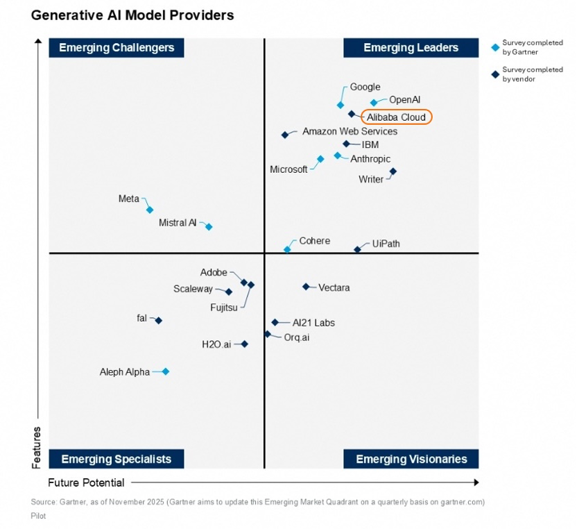四家云厂商依旧位居领导者象限,阿里云在“feature(特征)”指标上还领先于AWS、微软,仅次于谷歌和OpenAI。此外,IBM、Anthropic、Writer、Cohere和Uipath也位于领导者象限。Meta和Mistral AI则位于挑战者象限。